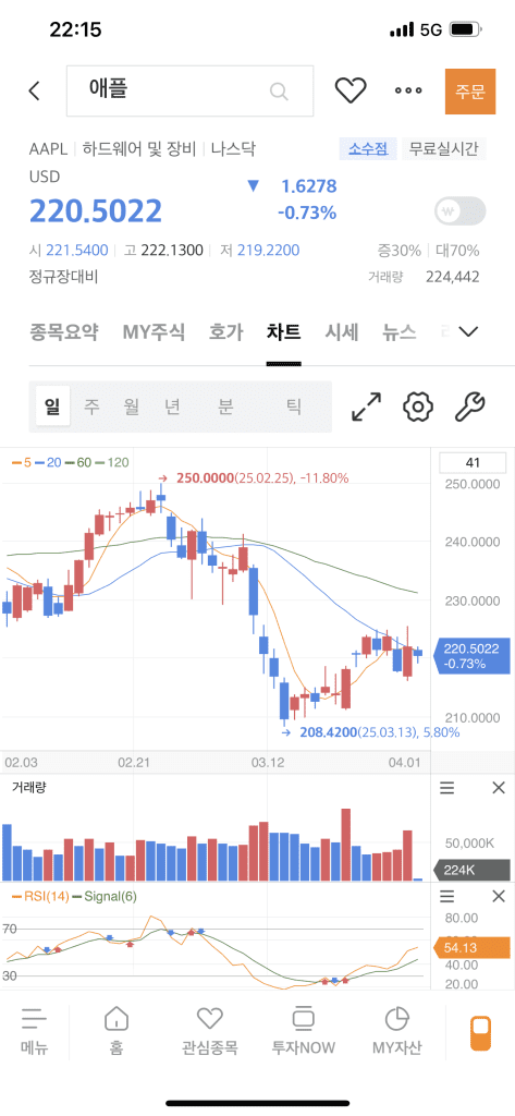 처음엔 조금만 사 놓고(정찰병 출동!) 주식 시장이 어떻게 돌아가는지 분위기만 보려고 했다. 그런데 마침 내가 들어간 시점이, 관세를 매개로 트럼프 대통령이 전 세계를 뒤흔드는 때였다. 그래서 애플, 구글 등 거대 기업 주가가 많이 떨어져 있었다.