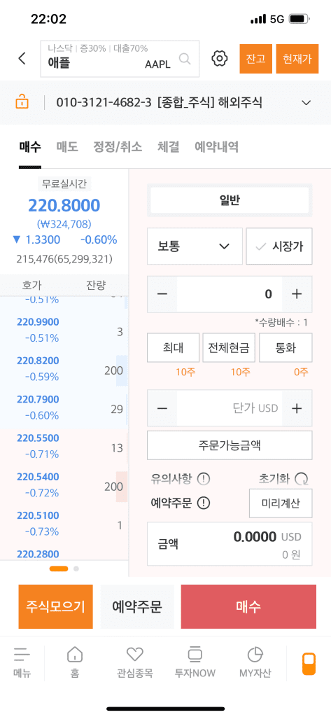 증권사 앱 실행 후 상단 검색 창에 원하는 종목을 입력한다. 국가, 거래소와 같은 구분은 관계없다. 모두 다 검색된다. 종목 이름을 써도 되고, 미국 주식은 티커라고 부르는 영문자를, 국내 주식은 고유 코드인 숫자를 입력해도 된다.