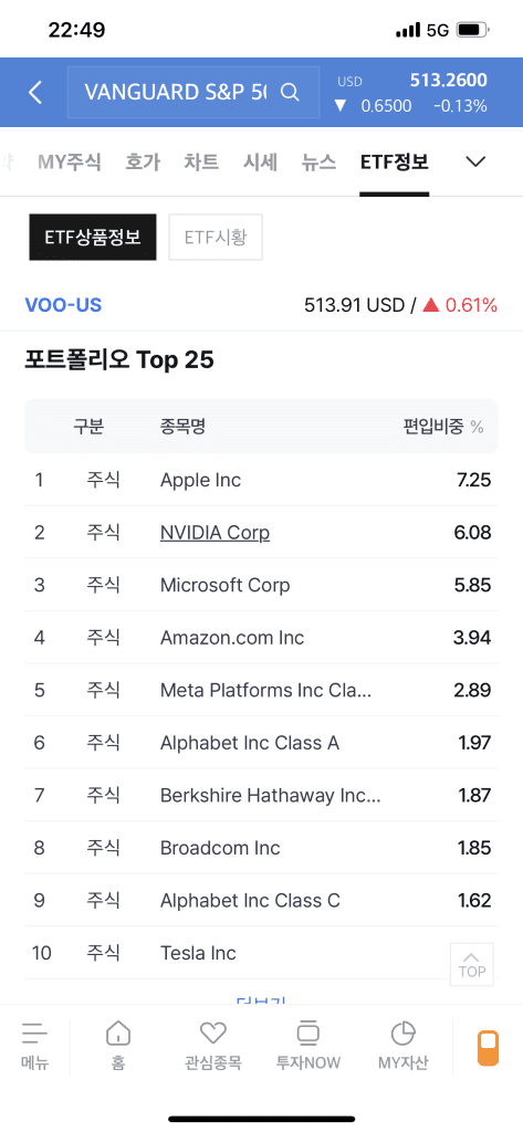• VOO ETF에는 애플이 7.25% 포함되어 있다. 그래서 애플이 좋은 실적을 냈을 때 VOO ETF 주가(?)도 오르긴 하겠지만, 애플 주식을 가진 것 보다는 작을 것이다. 반대로 애플 주가가 낮아지는 경우에도 그 비율이 적어서 데미지가 크게 다가오진 않을 것이다.